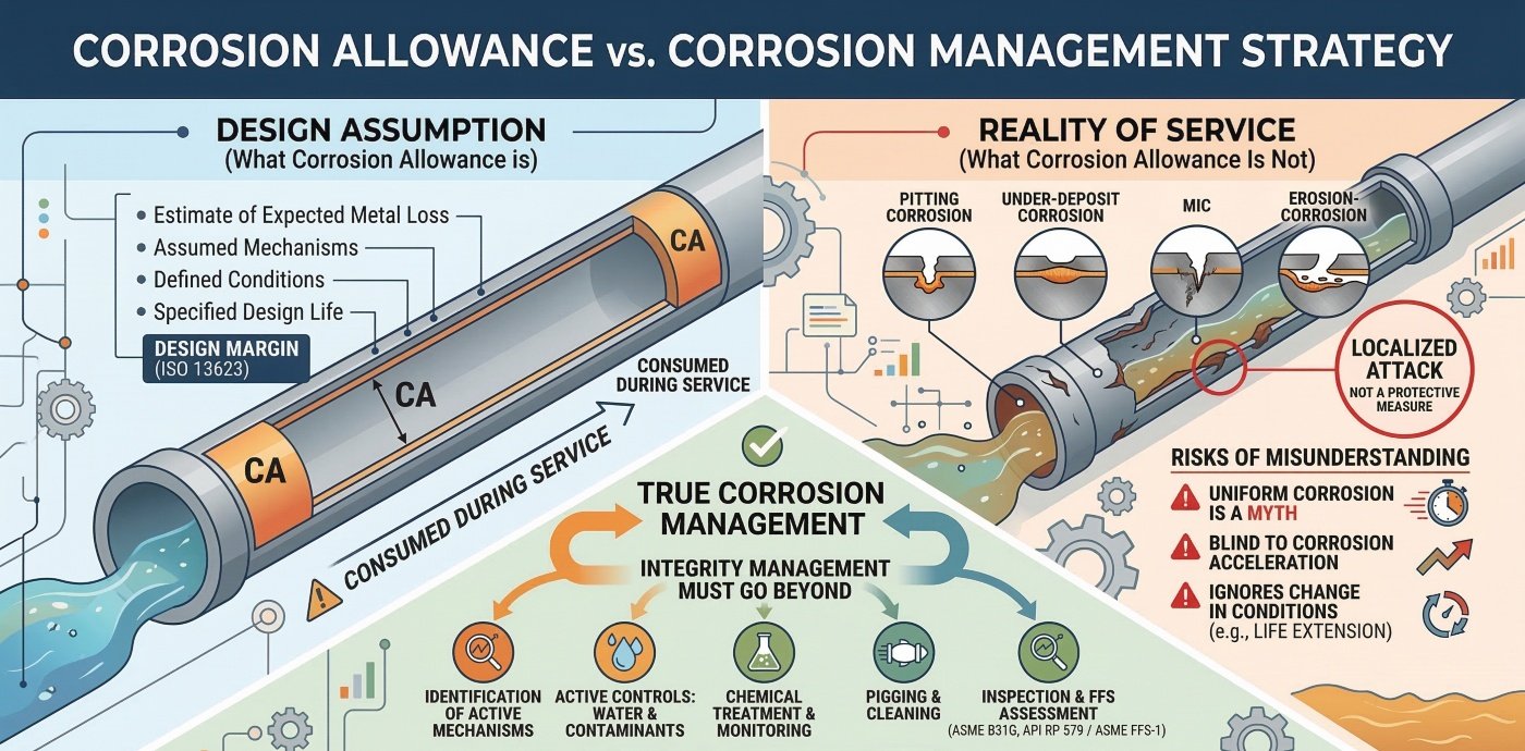 Corrosion allowance merely delays failure. It does not reduce corrosion rates, nor does it prevent localized attack. Treating corrosion allowance as a protective measure often leads to delayed mitigation and underestimated risk.