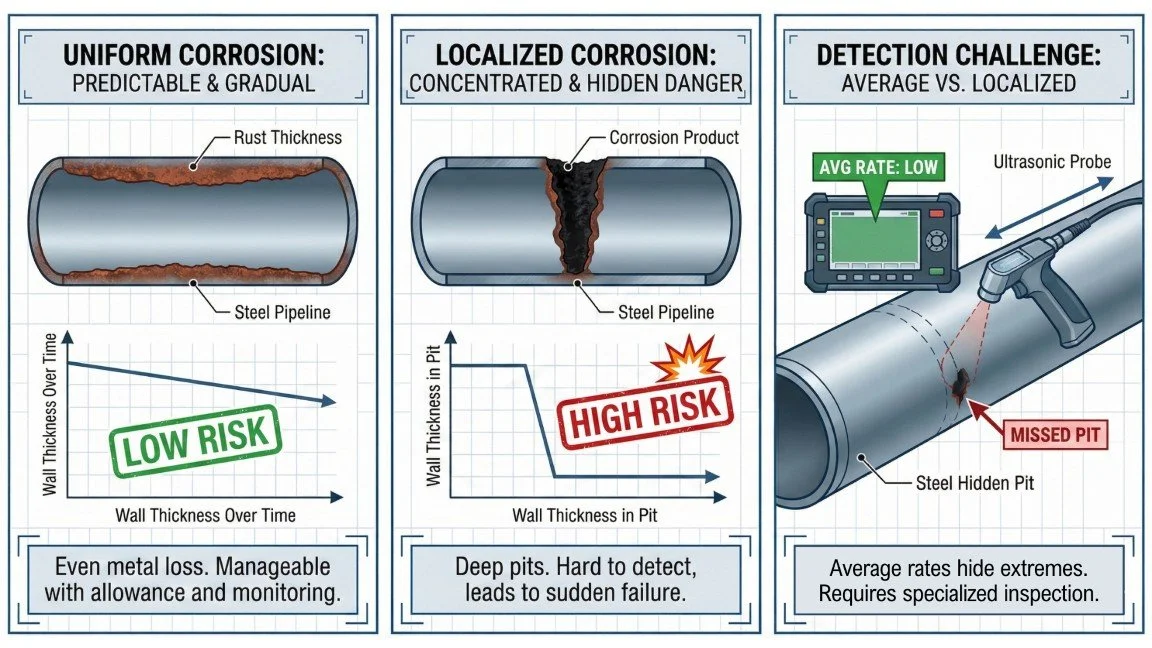 This approach overlooks a critical reality: uniform corrosion is often far less dangerous than localized corrosion, even when average corrosion rates appear low. Most catastrophic pipeline failures are driven by localized damage mechanisms that escape conventional corrosion indicators.